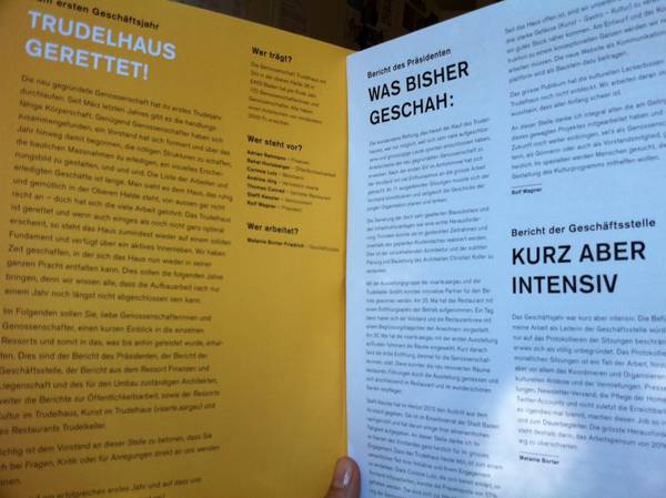 Die Generalversammlung der Genossenschaft TRUDELHAUS fand am Dienstag, 10. Juni 2014 im Trudelkeller statt. Den Jahresbericht 2013 können Sie jetzt runterladen.